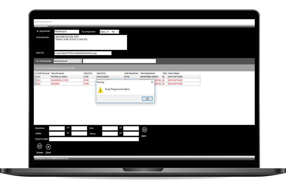 Batik Profesional memiliki fitur untuk menginput pengumuman yang akan diberikan kepada karyawan. Melalui ini, Anda dapat membuat pengumuman yang dapat dilampirkan gambar. Nantinya pengumuman ini otomatis akan terupload ke ESS, sehingga masing-masing karyawan dapat melihat pengumuman tersebut. Anda juga dapat melakukan filter karyawan siapa saja yang berhak mendapatkan pengumuman tersebut baik berdasarkan Departemen, Jabatan, Divisi, Cabang dan custom formula.