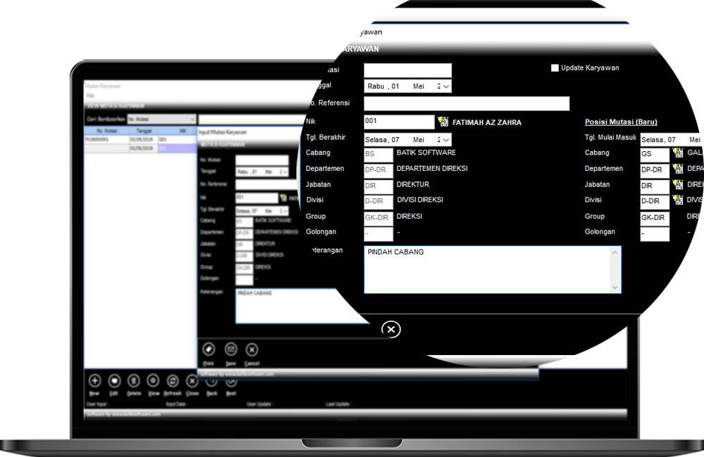 Fitur Transfer Karyawan ini berfungsi apabila terdapat pemindahan karyawan baik antar Departemen, Divisi, Jabatan, Group, Golongan serta Cabang. Fitur Transfer Karyawan ini sudah termasuk didalamnya Mutasi, Demosi maupun Promosi. Nantinya data history transfer karyawan akan tampil pada Data Karyawan >> Riwayat Kerja Sekarang.