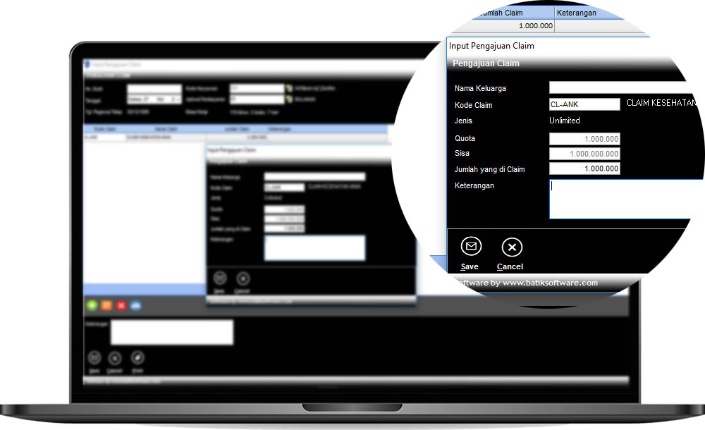 Batik Profesional menyediakan fitur klaim, sebelumnya klaim akan diberikan kepada karyawan yang masing-masing jenis klaim dan budgetnya bisa berbeda-beda. Selanjutnya karyawan dapat melakukan pengajuan klaim, untuk kemudian pengajuan tersebut dapat di Acc/Tolak. Nilai klaim tersebut nantinya akan masuk ke slip gaji bersamaan saat hitung gaji bulanan.