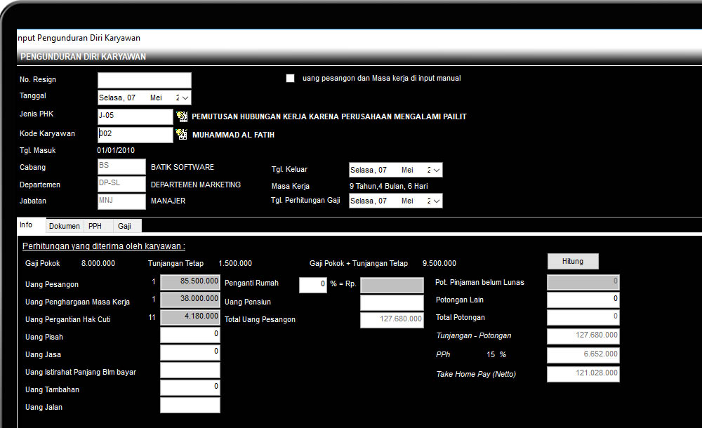 Pengunduran Diri pada Batik Profesional memberikan Anda kemudahan dalam mengelola pesangon karyawan. Pesangon, Uang Penghargaan, serta Uang Pengganti akan terhitung otomatis berdasarkan UU Ketenagakerjaan No.13 Tahun 2003. Selain itu, pajak atas uang pesangon juga otomatis akan terhitung.