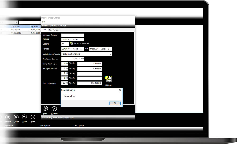 Perhitungan Service Charge disini adalah service charge untuk hotel dan restoran. Batik Profesional menyediakan 3 metode perhitungan service charge, yaitu Pembagian Sama Rata, Pembagian Sama Rata dan Point, dan Pembagian Point.