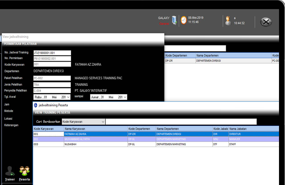 Selanjutnya apabila terdapat permintaan pelatihan yang telah di Acc, data permintaan tersebut secara otomatis akan masuk ke Jadwal Pelatihan. Pada jadwal tersebut akan dikelola kembali untuk diubah, apakah data trainernya akan berubah atau data pesertanya yang akan berubah.