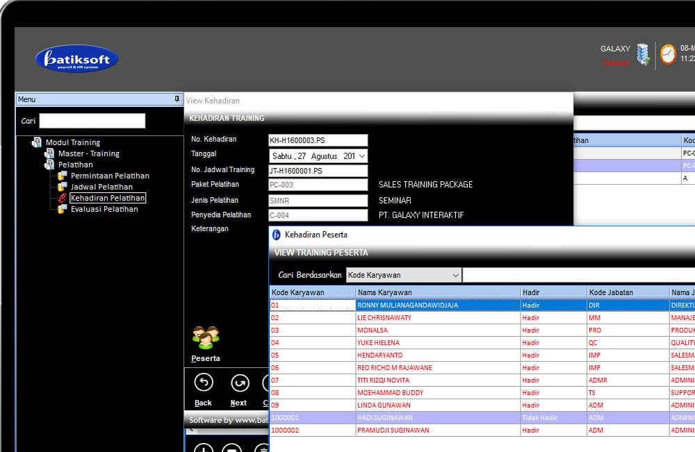 Fitur kehadiran ini digunakan untuk mengelola kehadiran peserta training, dari fitur tersebut dapat diketahui apakah peserta yang telah terdaftar pada Jadwal Pelatihan sebelumnya hadir atau tidak sehingga dapat diketahui total peserta yang hadir dan yang tidak hadir.