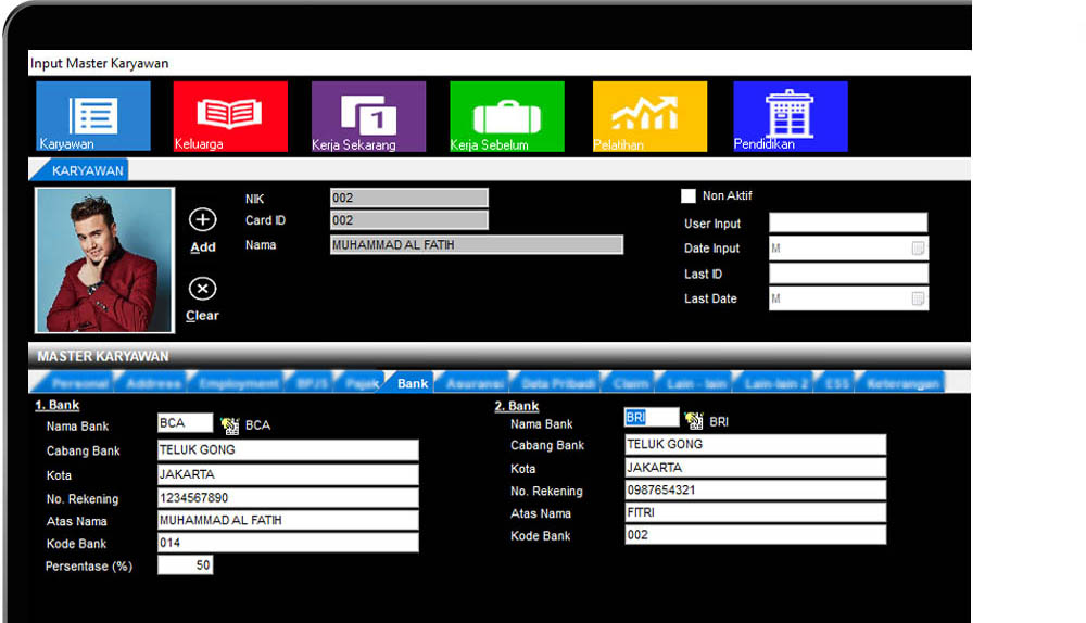 Karyawan dapat membagi gajinya ke 2 rekening yang berbeda sesuai dengan presentase yang diinput pada masing-masing rekening bank. Fitur ini sangat bermanfaat apabila karyawan bekerja diluar kota dan tempatnya jauh dari jangkauan ATM ataupun internet, dapat dengan mudah mengirim sebagian gaji ke rekening keluarganya. Hasil dari pembagian atas presentase gaji ini, akan tercatat pada data transfer gaji karyawan.