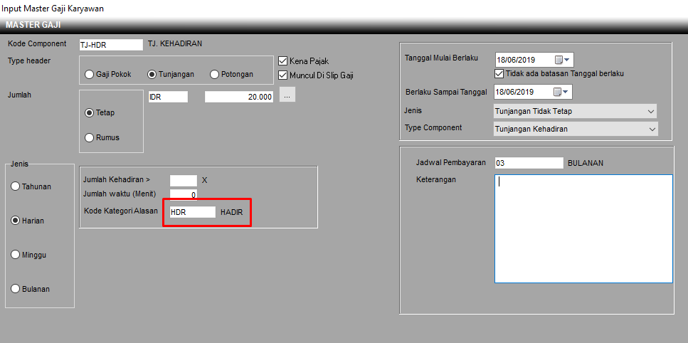 Kode Kategori Absen / Tidak Hadir : Klik 2x untuk mengambil kode kategori alasan tidak hadir, untuk menentukan kode ketidakhadiran. Sehingga dapat diketahui bahwa setiap ada ketidakhadiran, maka karyawan akan mendapatkan potongan.