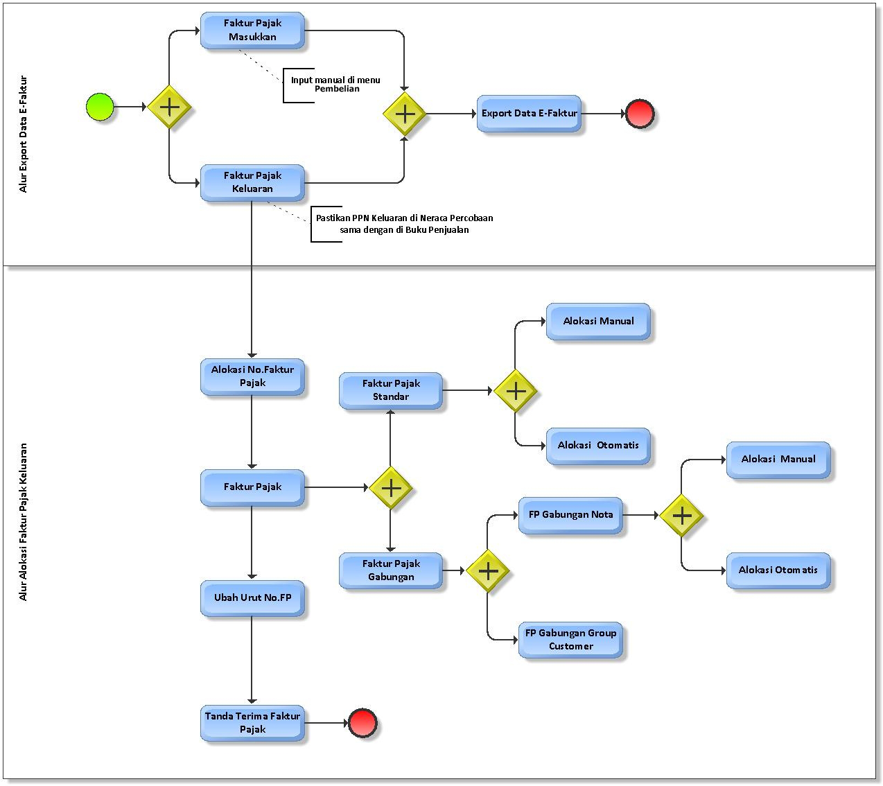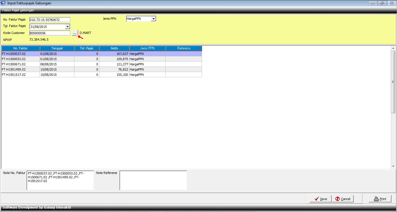 Faktur Pajak Gabungan Nota diartikan bahwa 1 No.Faktur Pajak bisa dipakai oleh beberapa Nota dalam 1 Customer. Terdapat 2 cara mengalokasikan No.Faktur Pajak, yaitu Alokasi No.Faktur Pajak Manual dan Alokasi No.Faktur Pajak Otomatis.