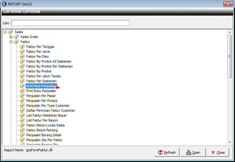 1) Buka Modul Penjualan >> Report Sales >> Faktur >> Print Nota Penjualan, maka muncul tampilan/jendela report.