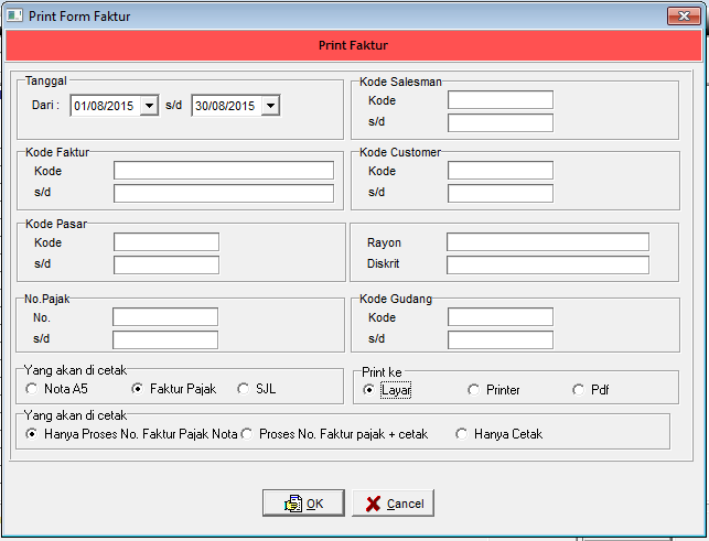 | Yg akan dicetak | Pilih Faktur Pajak dan pilih Hanya Proses No.Faktur Pajak |