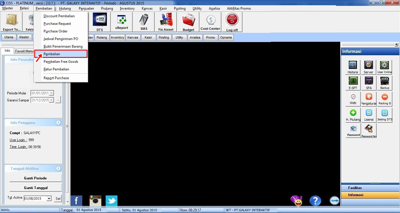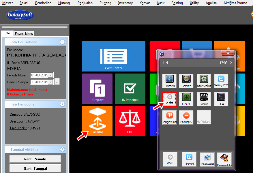 1) Pada tampilan awal CDS pilih menu Fasilitas -> E-Faktur.