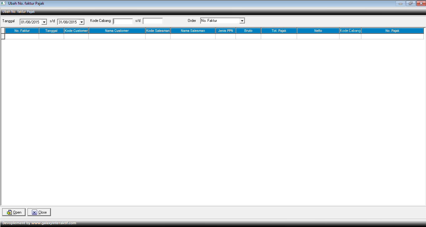 | Cabang | Diisi kode cabang jika akan menampilkan faktur pajak berdasarkan cabang yang dipilih, jika akan menampilkan semua cabang kolom ini sebaiknya dikosongkan saja |