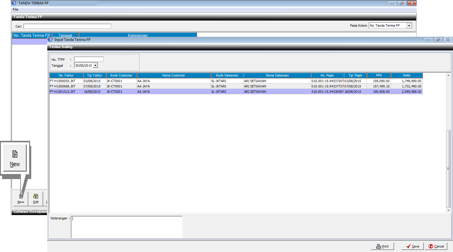 2) Maka tampil jendela Tanda Terima, klik tombol New untuk menambah data.
