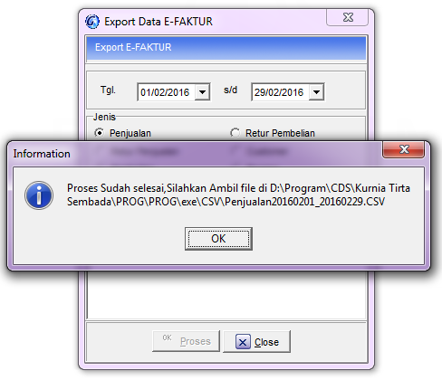 4) Setelah proses selesai maka akan tampil jendela pemberitahuan penyimpanan file export E-Faktur format CSV, klik OK untuk menutupnya.
