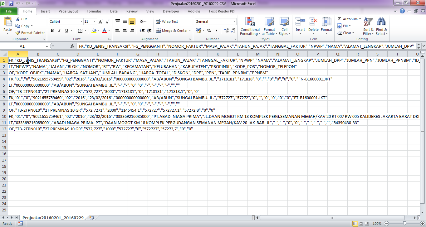 Berikut contoh file hasil Export E-Faktur Penjualan: