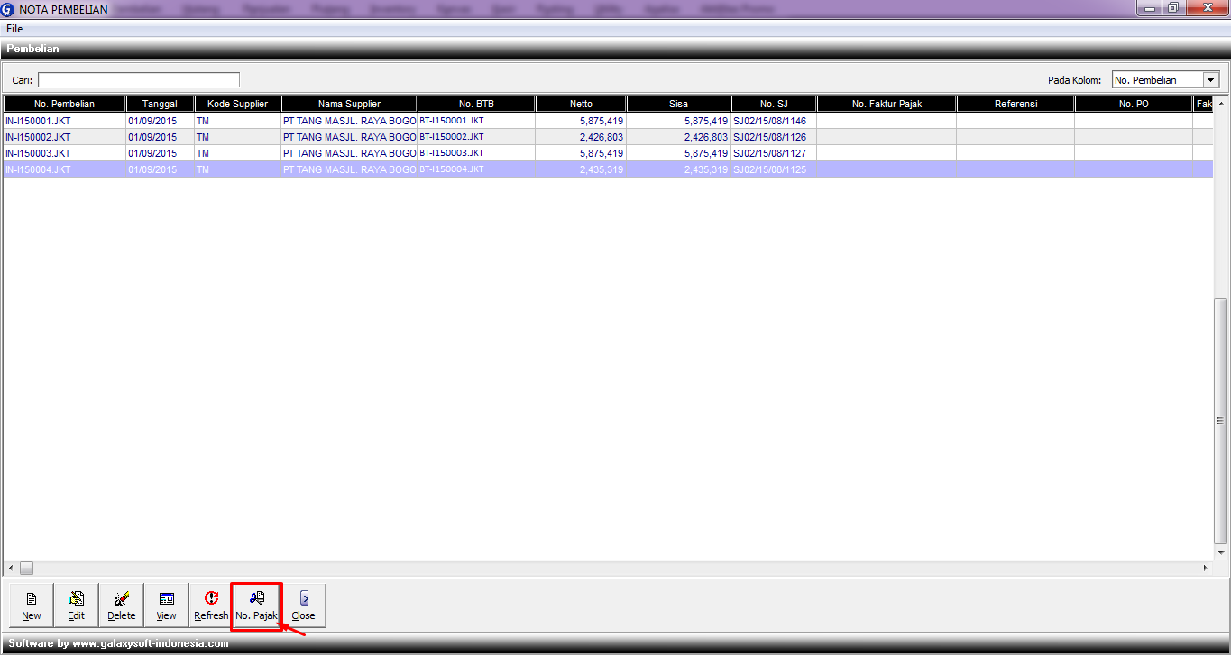 2) Pilih No.Pembelian yang akan dimasukkan Alokasi Faktur Pajaknya, kemudian klik No.Pajak.