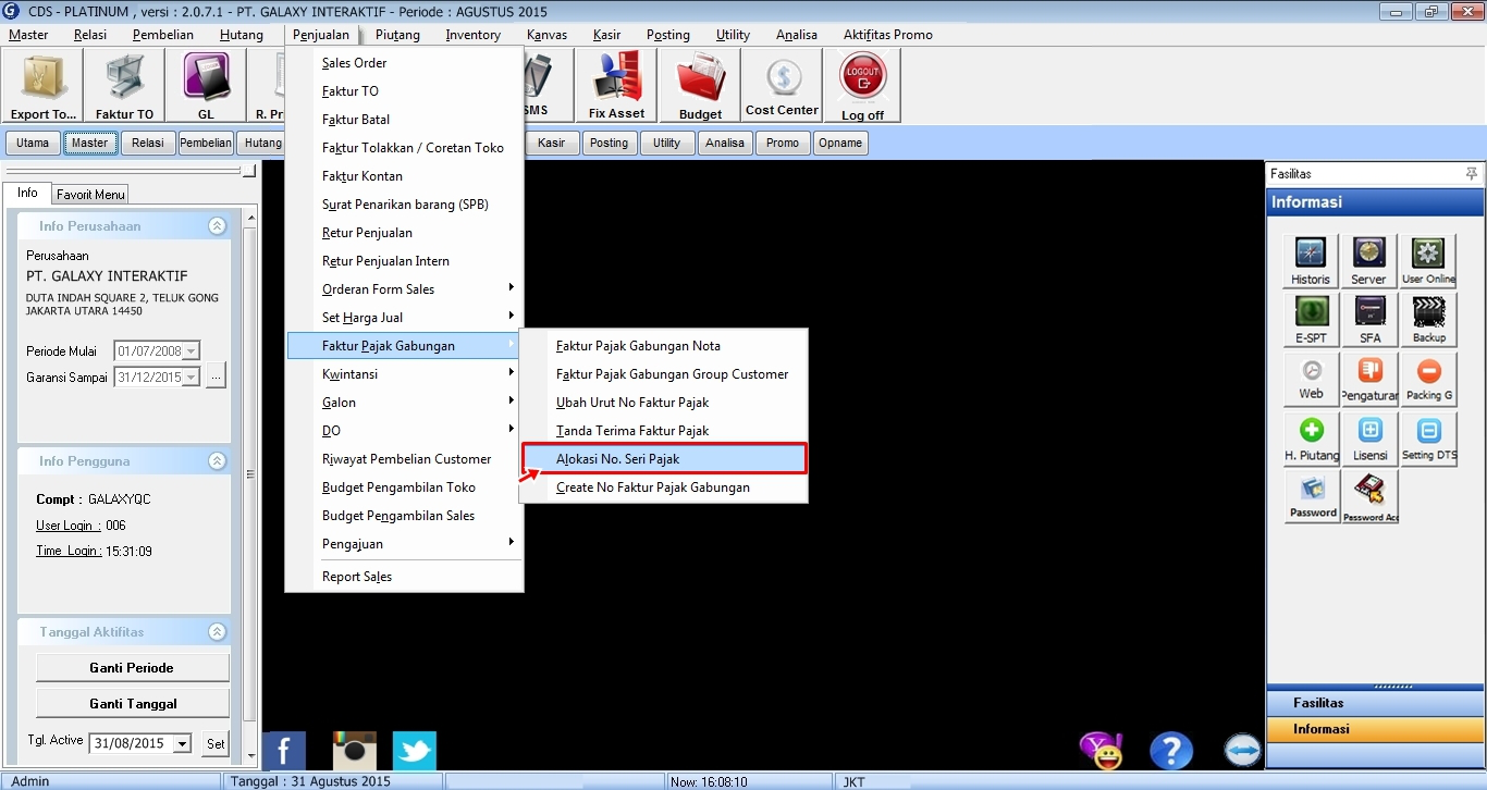 1) Buka Modul Penjualan >> Faktur Pajak Gabungan >> Alokasi No.Faktur Pajak, lihat gambar dibawah ini.