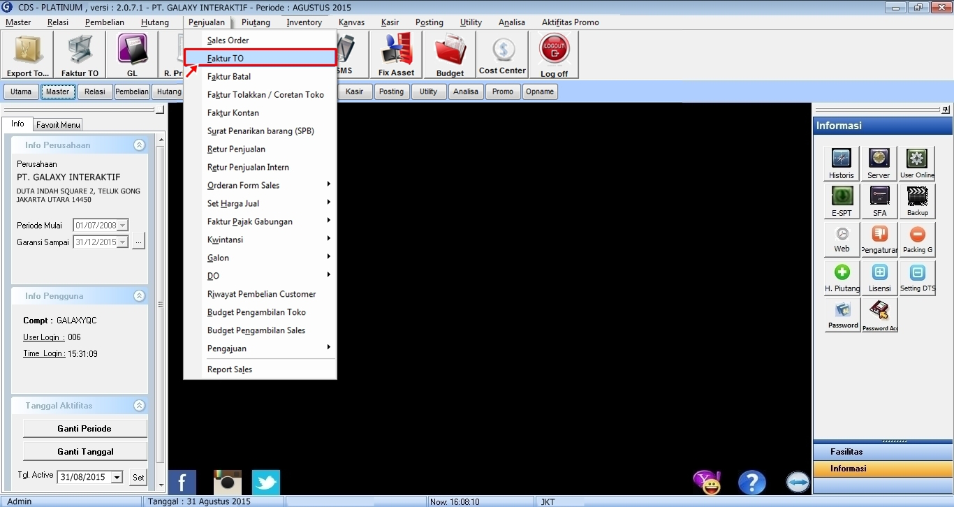 1) Buka Modul Penjualan >> Faktur TO, lihat gambar dibawah ini.