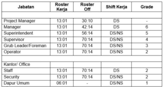 Roster Kerja = 13/1, artinya karyawan bekerja selama 13 hari setelah itu otomatis jadwal kerja akan off 1 hari .