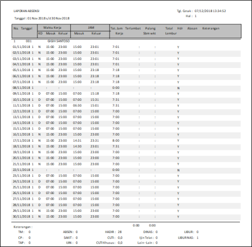 Contoh Operator mulai bekerja 26 Oktober 2018 dengan jadwal November 2018 sbb. Periode 1-31, buat laporan Rincian Absensi - 1 untuk periode November 2018 dengan jadwal sesuai dengan data dibawah ini.