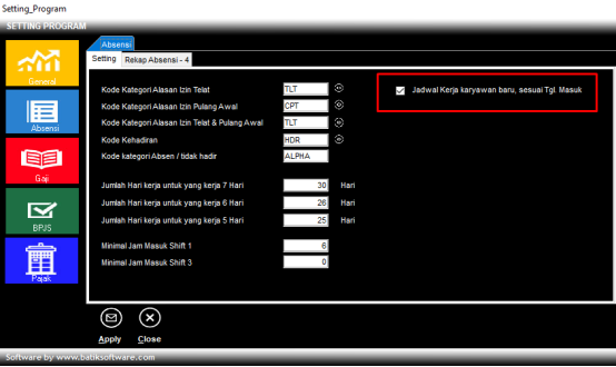 - Checklist Jadwal Kerja Karyawan Baru, Sesuai Tgl.Masuk di menu Setting Program -> Absensi