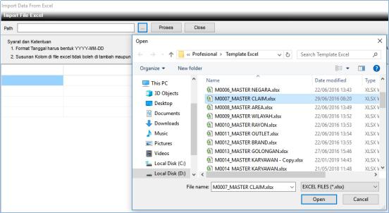 3. Maka muncul jendela Import File Excel, pilih Elipsis untuk mengambil file yang akan diimport dengan nama file M0006_MASTER CLAIM.xls (harus ada di folder Template Excel).