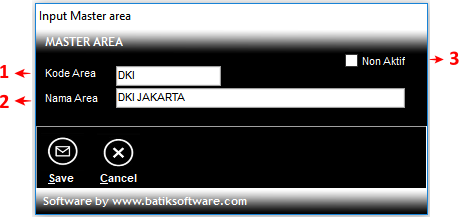 - Area tidak boleh dihapus atau diubah kodenya jika sudah dipakai pada Wilayah, karena akan mengakibatkan data Wilayah.