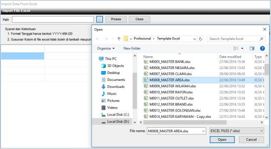3. Maka muncul jendela Import File Excel, pilih Elipsis untuk mengambil file yang akan diimport dengan nama file M0021_MASTER AREA.xls (harus ada di folder Template Excel).