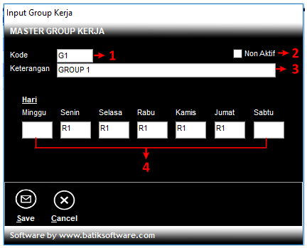 Menu ini digunakan untuk menginput group kerja karyawan dari hari senin s/d hari minggu berdasarkan waktu kerja yang sudah dibuat. Apabila terdapat hari yang tidak perlu diinput waktu kerjanya, maka kolom hari dikosongkan saja. 1 karyawan bisa bekerja 2 shift dalam sehari dengan mengatur jamnya pada menu ini.