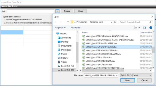 3. Maka muncul jendela Import File Excel, pilih Elipsis untuk mengambil file yang akan diimport dengan nama file M0014_MASTER GROUP KERJA.xls (harus ada di folder Template Excel).