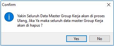 4. Klik Proses untuk mulai melakukan proses import, maka akan tampil pemberitahuan sebagai berikut. Pilih Yes untuk melanjutkan (seluruh data master Group Kerja yang lama akan terhapus) atau No untuk membatalkan.