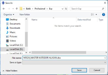 2. Maka muncul jendela untuk menyimpan file export, pilih folder kemudian isi nama file dan extention file kemudian klik Save untuk menyimpan.