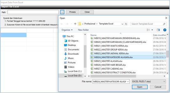 3. Maka muncul jendela Import File Excel, pilih Elipsis untuk mengambil file yang akan diimport dengan nama file M0015_MASTER JADWAL KERJA.xls (harus ada di folder Template Excel).