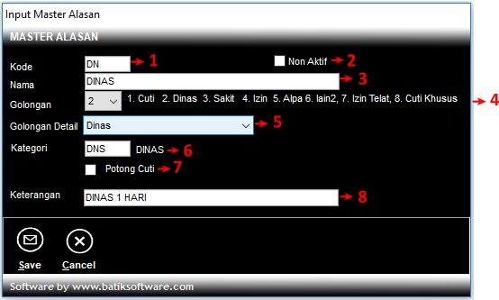 Menu ini digunakan untuk menginput alasan yang akan dipakai pada saat pembuatan surat izin apabila karyawan tidak masuk atau telat masuk, cuti dll. Master Alasan ini juga terkait dengan kode telat masuk dan kode pulang cepat.