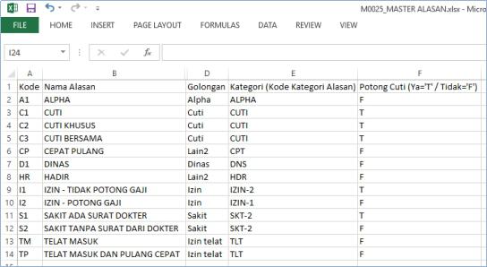 2. Buka template dengan nama M0016_MASTER ALASAN.xls, nama template ini tidak boleh diubah.
