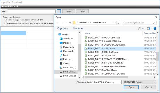 3. Maka muncul jendela Import File Excel, pilih Elipsis untuk mengambil file yang akan diimport dengan nama file M0016_MASTER ALASAN.xls (harus ada di folder Template Excel).