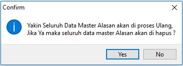 4. Klik Proses untuk mulai melakukan proses import, maka akan tampil pemberitahuan sebagai berikut. Pilih Yes untuk melanjutkan (seluruh data master Alasan yang lama akan terhapus) atau No untuk membatalkan.