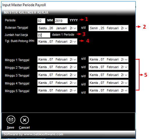 Menu ini digunakan untuk menginput periode kerja dalam 1 bulan, apabila periode ini belum diisi maka proses absensi tidak akan ada hasilnya/kosong, user juga tidak dapat melakukan proses gaji dan proses pembayaran pinjaman maupun transaksi lainnya. Master periode ini juga berpengaruh terhadap report gaji bulanan/mingguan sehingga tanggal pembayaran gaji bulanan/mingguan harus diinput.