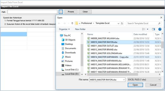 3. Maka muncul jendela Import File Excel, pilih Elipsis untuk mengambil file yang akan diimport dengan nama file M0023_MASTER RAYON.xls (harus ada di folder Template Excel).
