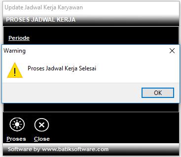 Menu ini digunakan untuk melakukan proses terhadap jadwal kerja yang sebelumnya telah diinput pada Master Data Karyawan yang masing-masing karyawan diberikan jadwal kerja sesuai dengan Master Jadwal Kerja. Proses ini dilakukan agar program dapat menghitung ulang jadwal kerja sesuai dengan periode berjalan. Jika belum dilakukan proses jadwal kerja, maka absensi pada periode tersebut tidak akan tampil.