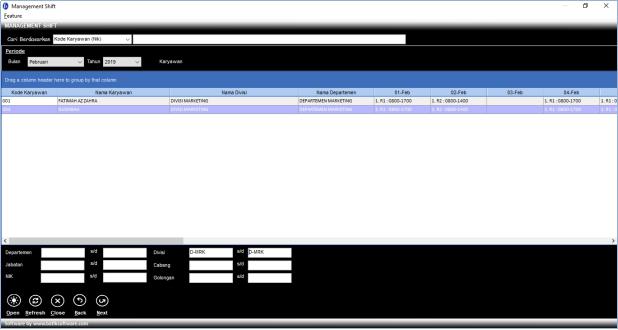 3. Setelah semua parameter diisi, klik tombol Open untuk memproses data management shift, maka akan muncul data jadwal kerja selama 1 bulan.