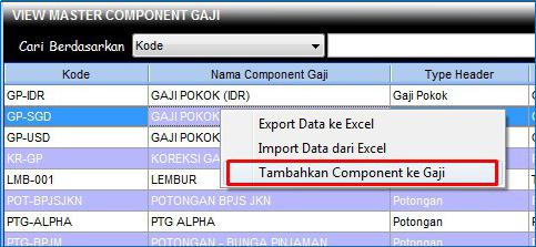 1. Buka Modul Gaji -> Master -> Component Gaji, pilih kode komponen yang akan ditambahkan kemudian klik kanan pilih Tambahkan Component ke Gaji.