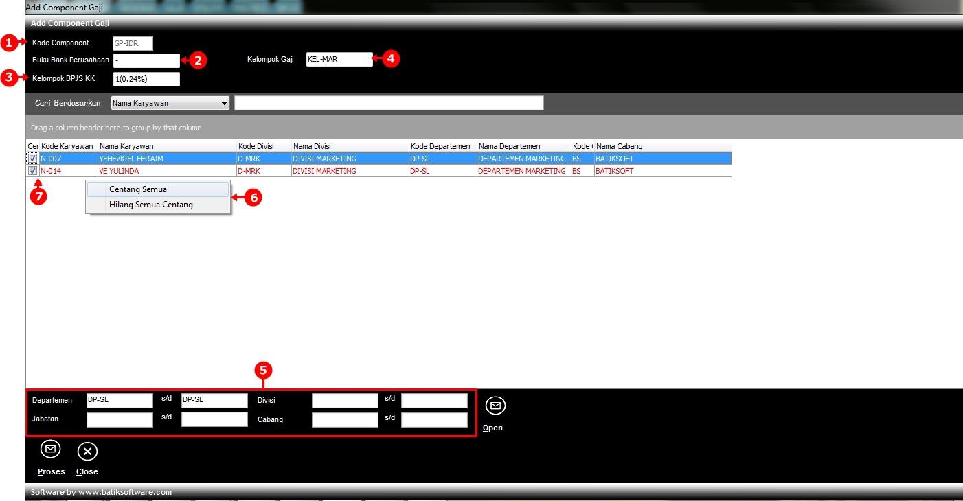 | 4 | Kelompok Gaji | Klik 2x untuk mengambil kelompok gaji yang akan ditambahkan component gaji tersebut |