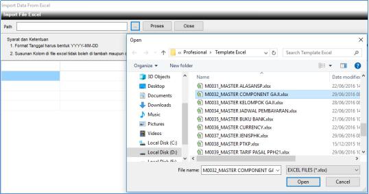 3. Maka muncul jendela Import File Excel, pilih elipsis untuk mengambil file yang akan diimport dengan nama file M0032_MASTER COMPONENT GAJI.xlsx (harus ada di folder Template Excel).