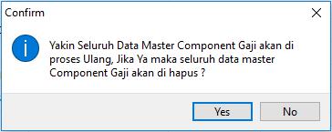 4. Klik Proses untuk mulai melakukan proses import, maka akan tampil pemberitahuan sebagai berikut. Pilih Yes untuk melanjutkan (seluruh data master Component Gaji yang lama akan terhapus) atau No untuk membatalkan.