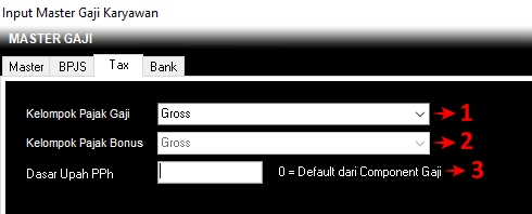 | 2 | Kelompok Pajak Bonus | Pilih metode perhitungan pajak bonus (Gross/ Net/ Gross Up) |