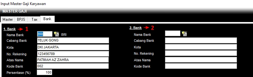 | 1 | Bank Utama | Diisi data rekening utama baik cabang bank, no.rekening bank, atas nama buku bank dan presentase. Jika gaji akan ditransfer ke satu rekening saja maka isikan 100. Jika gaji akan di transfer ke 2 rekening, maka presentase pada rekening utama diisi contoh 85 dan secara otomatis sisanya 15 akan masuk rekening bank lainnya |