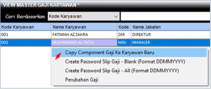 1. Pilih karyawan yang gajinya akan di copy ke karyawan baru, kemudian klik kanan dan pilih Copy Component Gaji ke Karyawan Baru.