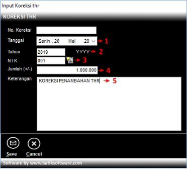 2. Maka akan tampil form Input Koreksi THR, input data sebagai berikut.