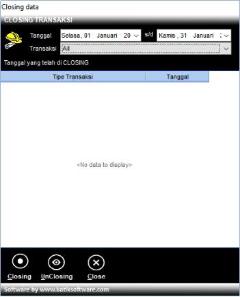 - Apabila terdapat transaksi yang akan dilakukan New/Edit/Delete namun tidak bisa karena sudah diclosing, solusinya adalah Unclosing transaksi sesuai dengan parameter tanggal. Caranya :