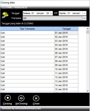 Menu ini digunakan untuk melakukan closing terhadap transaksi, apabila transaksi sudah dilakukan closing maka tidak dapat di lakukan penambahan data, perubahan data maupun hapus data. Beikut data-data yang dapat diclosing sesuai periode yang dipilih yaitu All semua transaksi meliputi Pengajuan Surat Izin/ Cuti, Surat Izin/ Cuti, Pengajuan Lembur, Surat Perintah Lembur, Surat Perintah Lembur, Lembur Extend, Koreksi Cuti, Jadwal Kerja, Perubahan Status Karyawan, Transfer Karyawan, Pinjaman, Pembayaran Pinjaman, Koreksi Gaji, Pengajuan Claim, Pembayaran Claim, Jadwal Kerja, Transfer NPWP, Kerja di Hari Libur atau satu persatu sesuai transaksi tersebut.