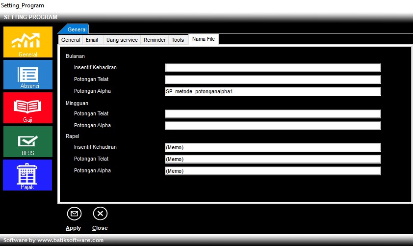 Tab ini digunakan untuk mengelola nama file SP untuk Insentif dan Potongan baik bulanan maupun mingguan.